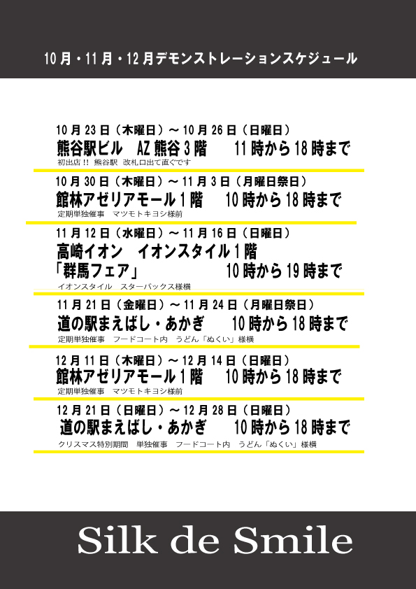 ここに文章を入れてください。 大好評のデモ販売のスケジュールの発表です‼ 是非一度「シルク デ スマイル」の デモ販売にお越しください。